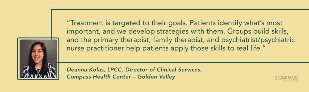 Treatment is targeted to their goals. Patients identify what’s most important, and we develop strategies with them. Groups build skills, and the primary therapist, family therapist, and psychiatrist/psychiatric nurse practitioner help patients apply those skills to real life.